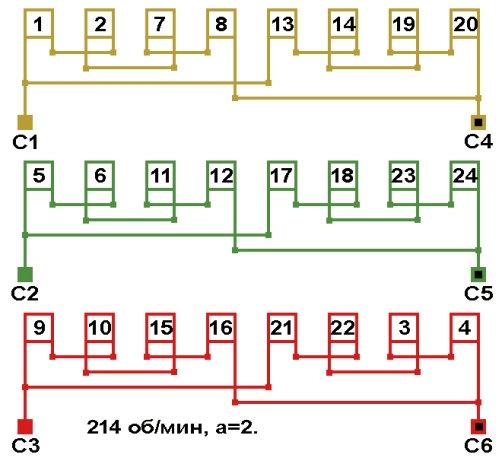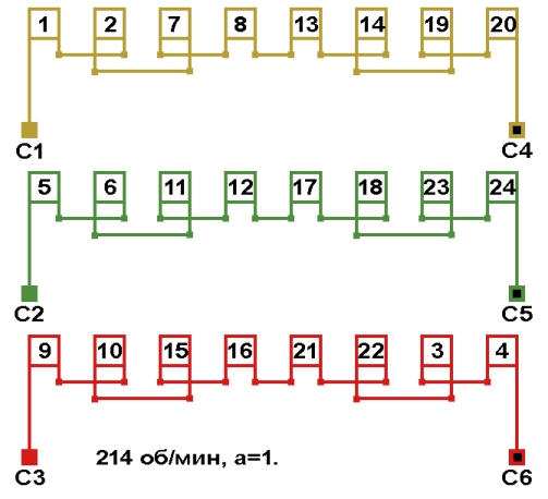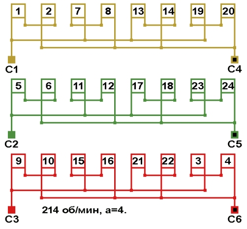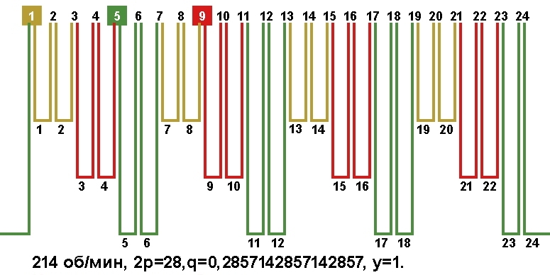 Схемы обмоток синхронных электродвигателей на постоянных магнитах, с количеством пазов 24, 2p=28 214 об/мин.