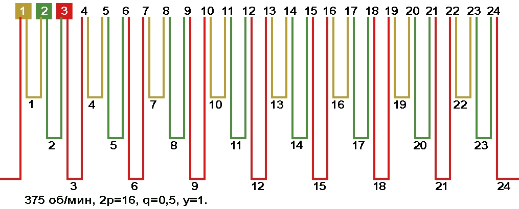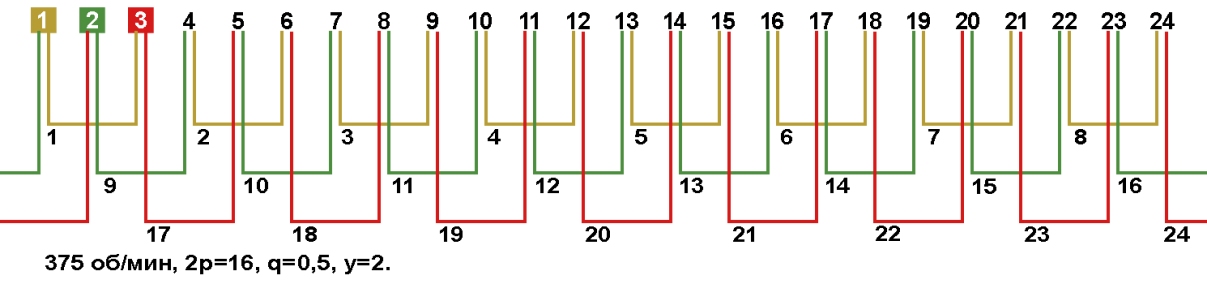 Схемы укладки обмоток электродвигателей с количеством пазов 24, 2p=16 375 об/мин.