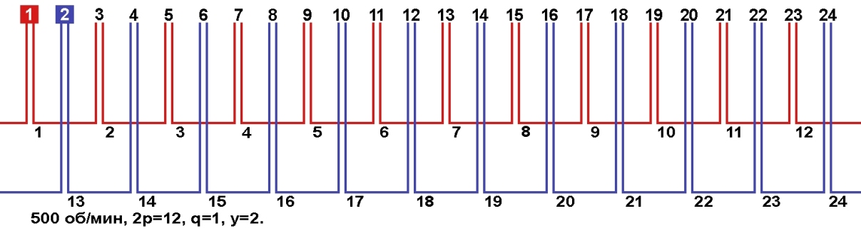 Схема укладки обмотки однофазного электродвигателя с количеством пазов 24, 2p=12 500 об/мин.