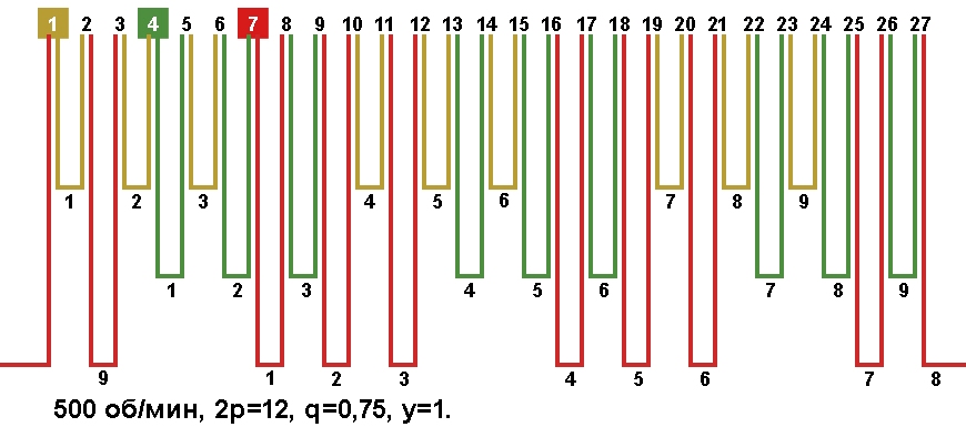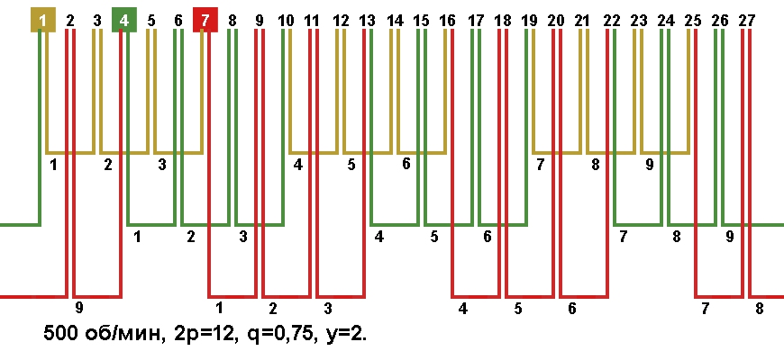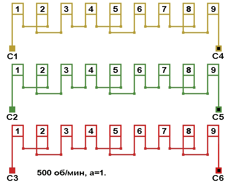 | Начало фаз по пазам | C1;C2;C3 | 1;2;4 |