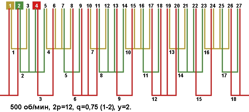 | Порядок чередования катушечных групп в периоде при дробном "q" | 1-2; | |