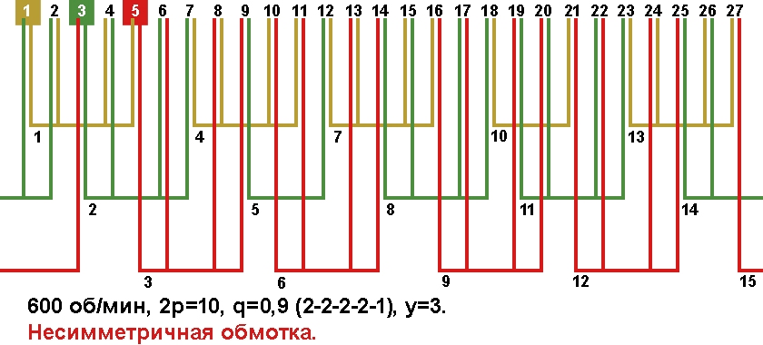 Схема укладки несимметричной обмотки электродвигателя с количеством пазов 27, 2p=10 600 об/мин.
