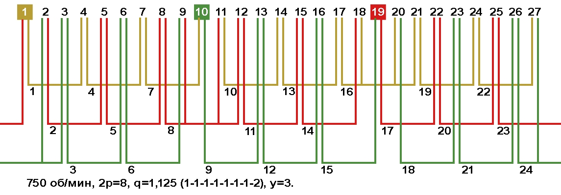 Схема укладки обмотки электродвигателя с количеством пазов 27, 2p=8 750 об/мин.