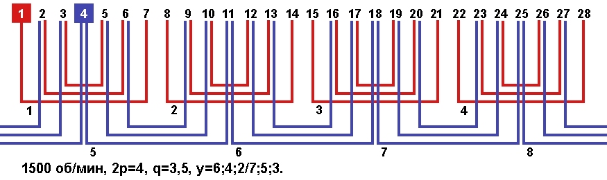 Схема укладки обмотки однофазного электродвигателя с количеством пазов 28, 2p=4 1500 об/мин.