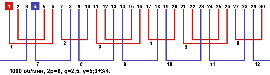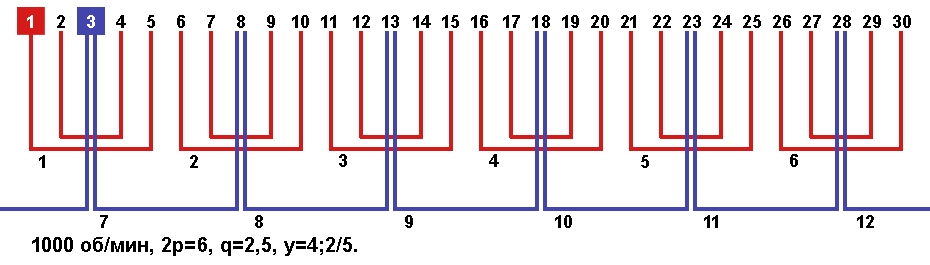 Схема укладки обмотки однофазного электродвигателя с количеством пазов 30, 2p=6 1000 об/мин.