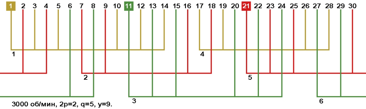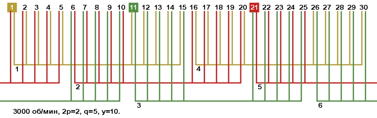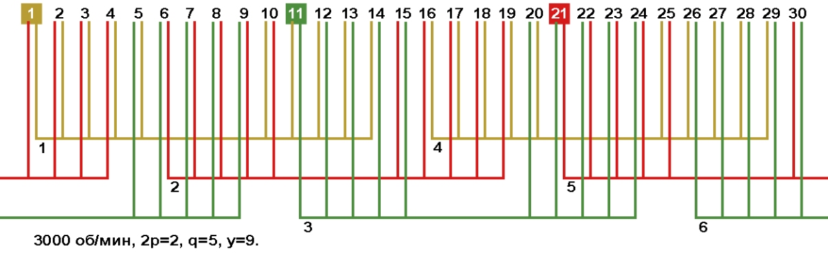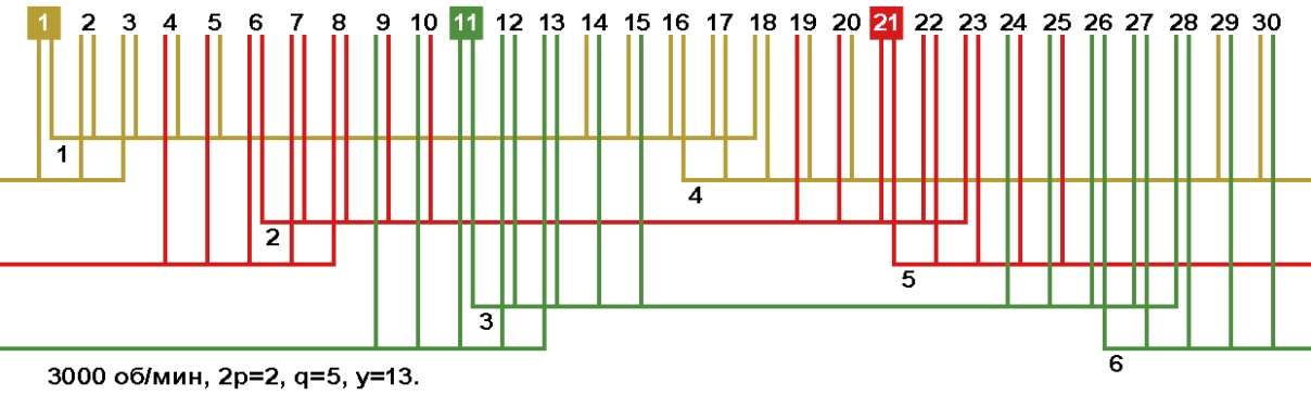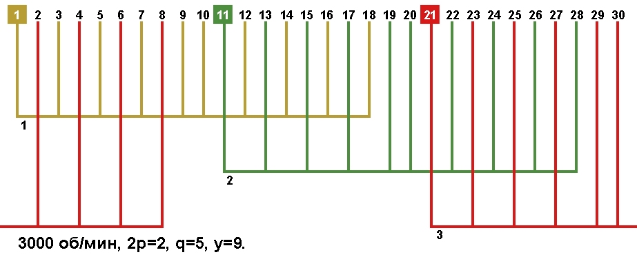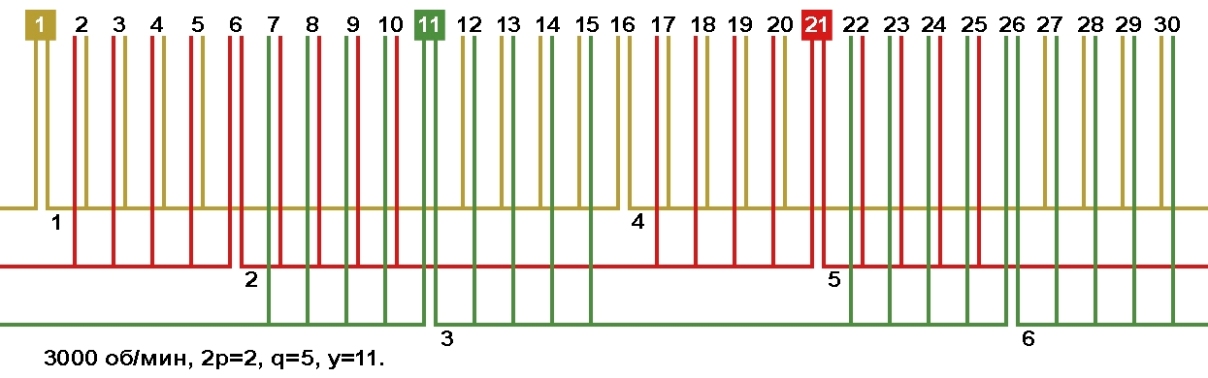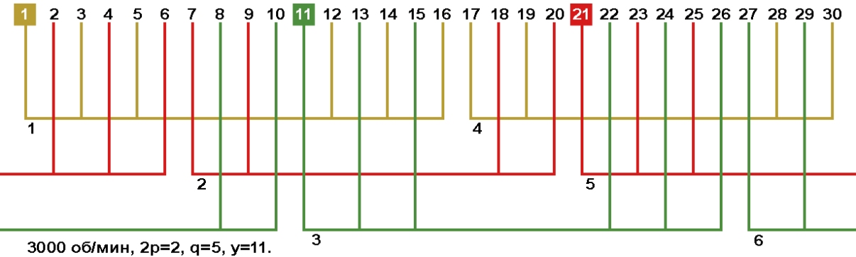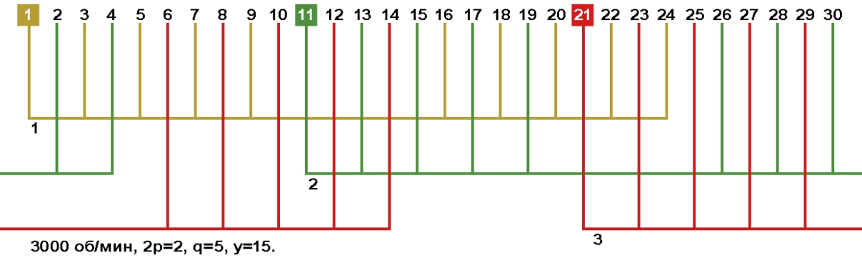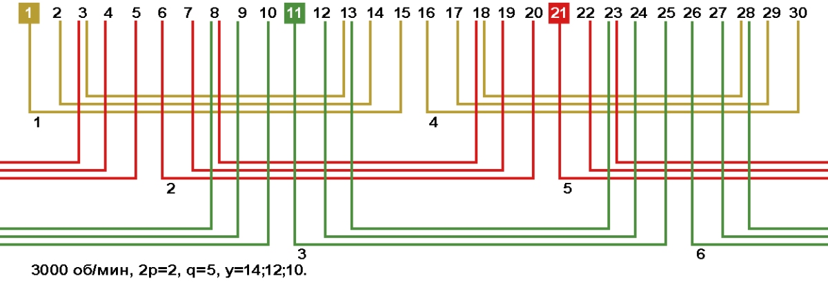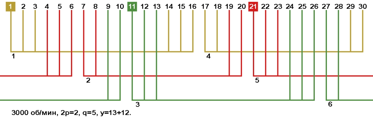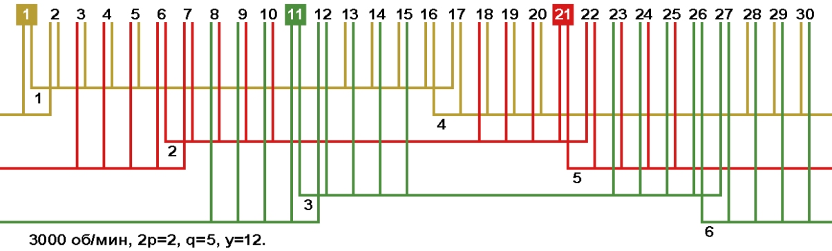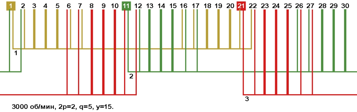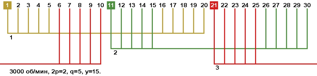 | Начало фаз по пазам | C1;C2;C3 | 1;11;21 |