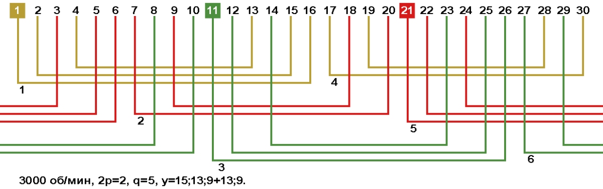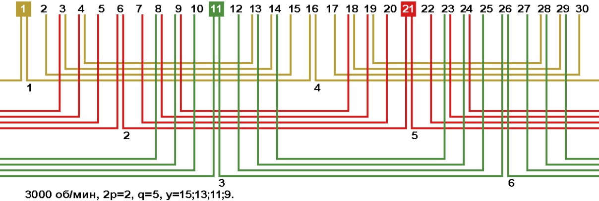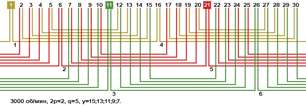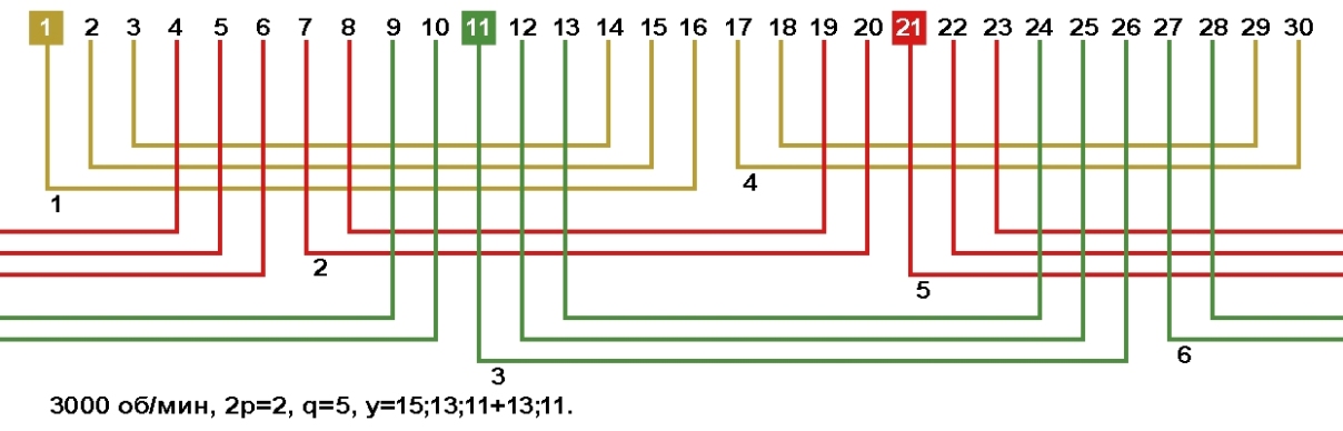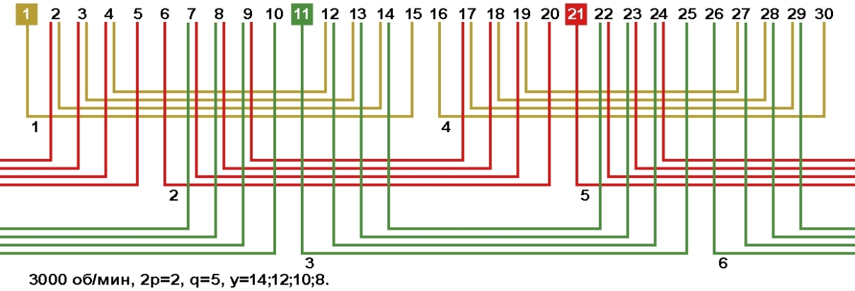 Схемы укладки обмоток электродвигателей с количеством пазов 30, 2p=2 3000 об/мин.