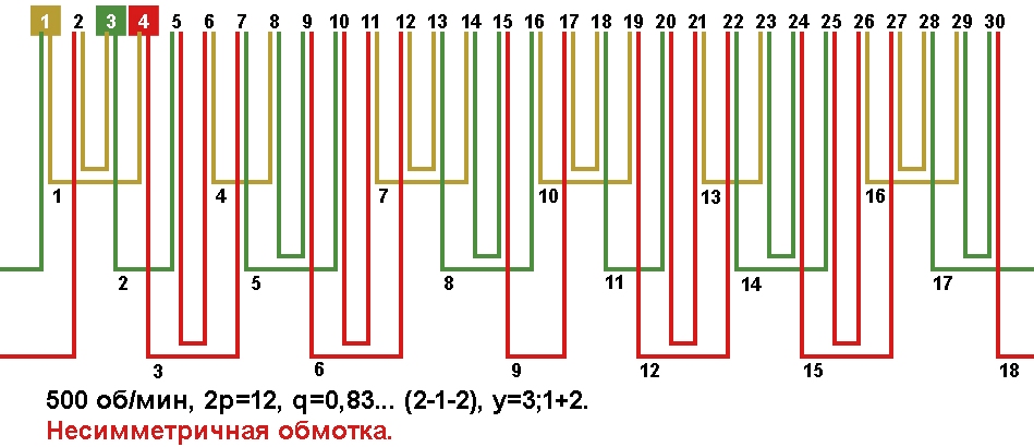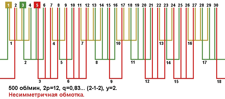 | Начало фаз по пазам | C1;C2;C3 | 1;3;5 несимметричная обмотка |