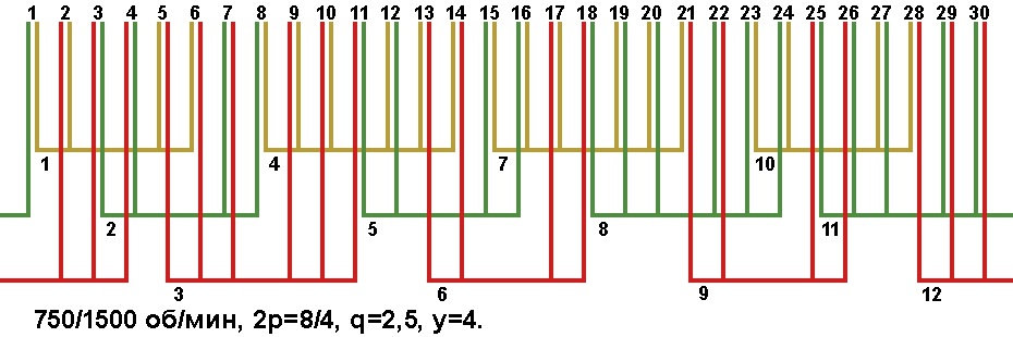 Схемы укладки двухскоростных обмоток. Z1=30, 2p=8/4, 750/1500 об/мин.