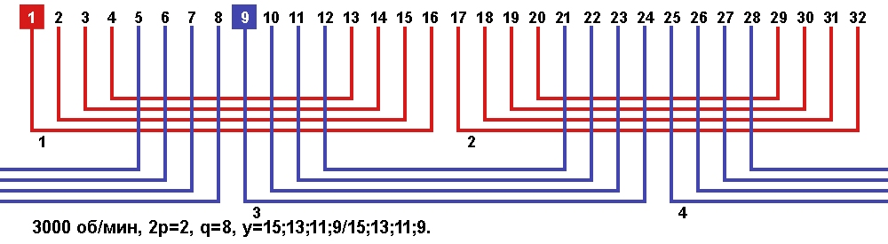 Схемы укладки обмоток однофазных электродвигателей с количеством пазов 32, 2p=2 3000 об/мин.