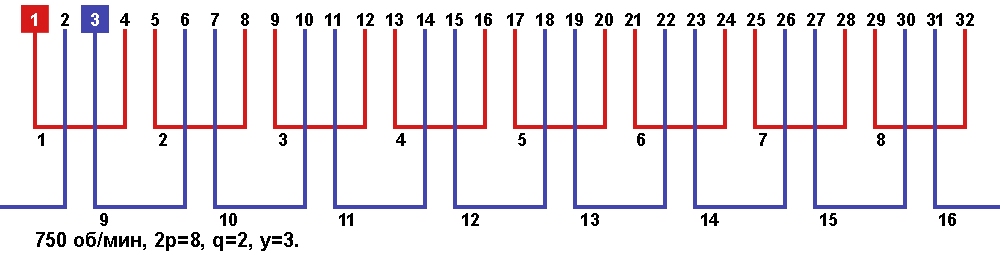 Схема укладки обмотки однофазного электродвигателя с количеством пазов 32, 2p=8 750 об/мин.