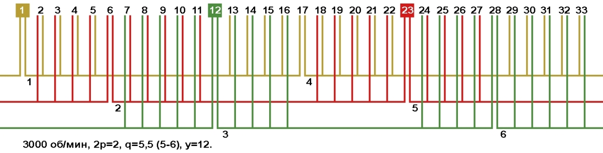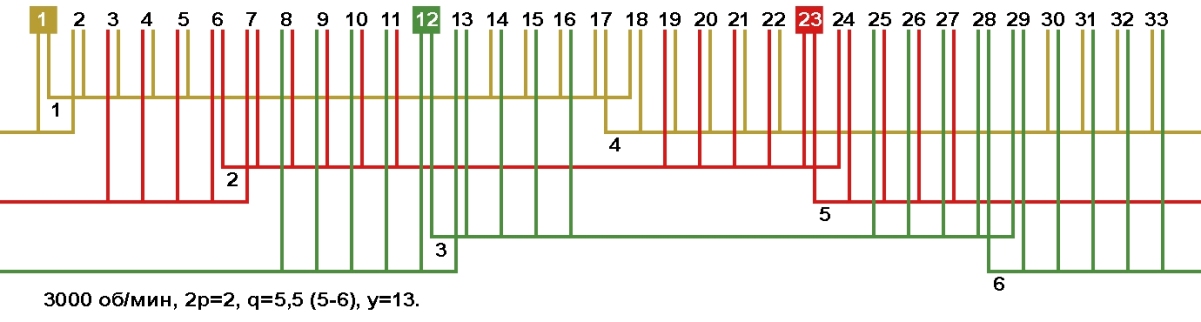 Схема укладки обмотки электродвигателя с количеством пазов 33, 2p=2 3000 об/мин.