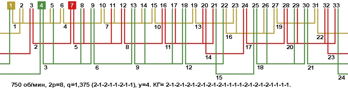 Схема укладки обмотки электродвигателя с количеством пазов 33, 2p=8 750 об/мин.