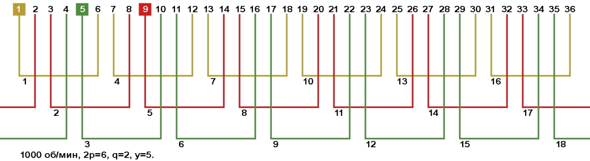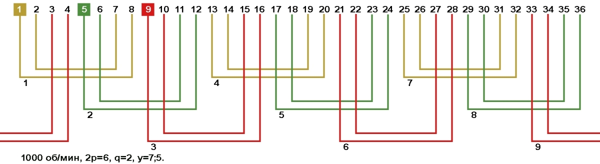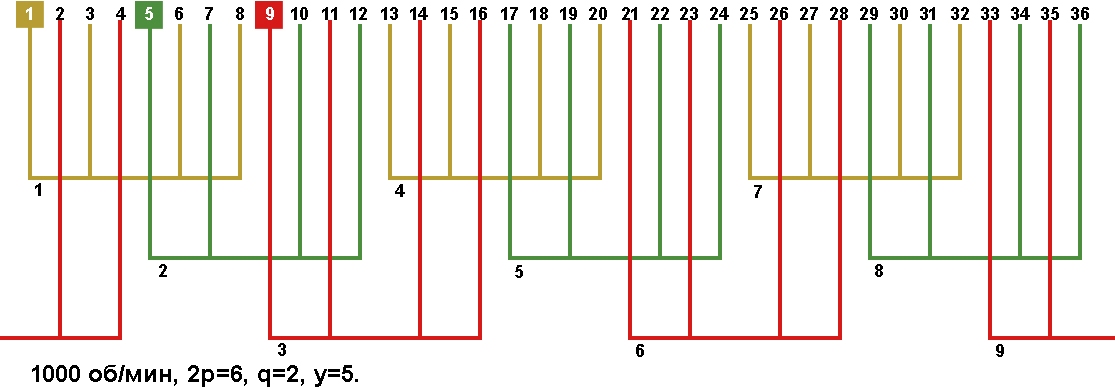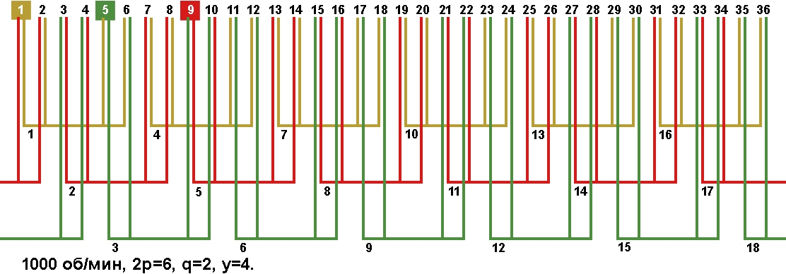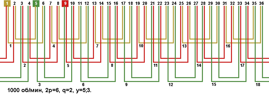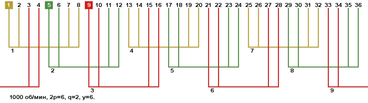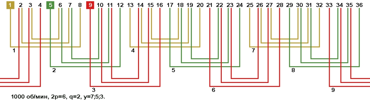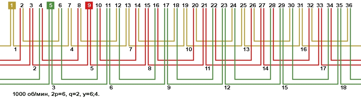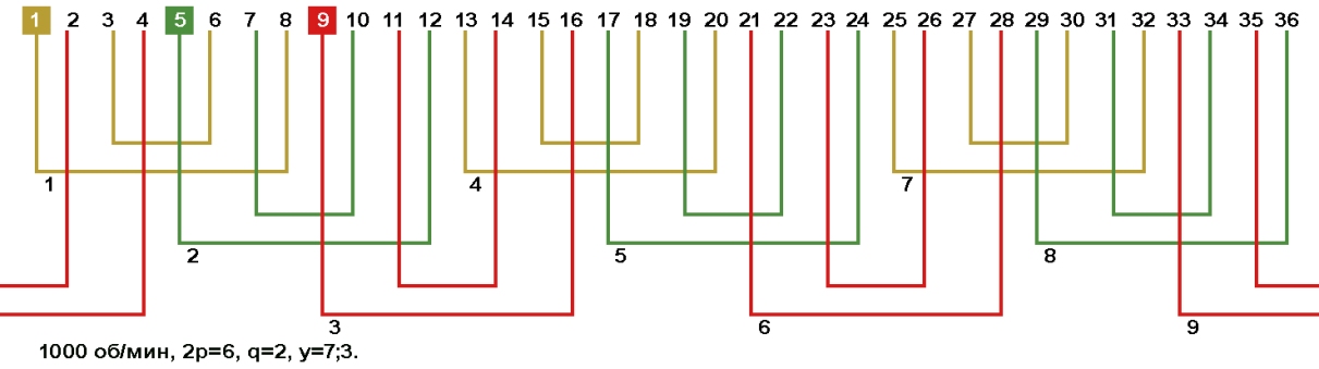 Схемы укладки обмоток электродвигателей с количеством пазов 36, 2p=6 1000 об/мин.