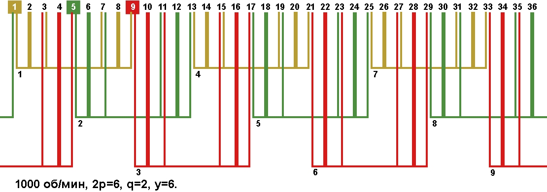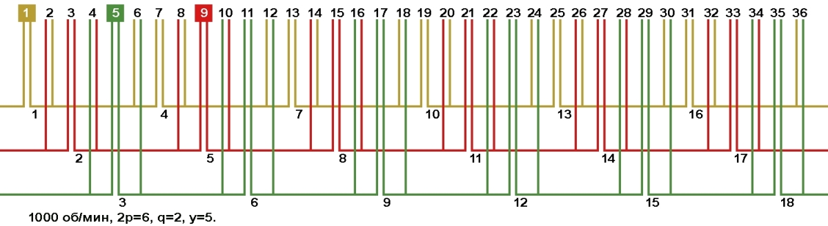 | Начало фаз по пазам | C1;C2;C3 | 1;5;9 |