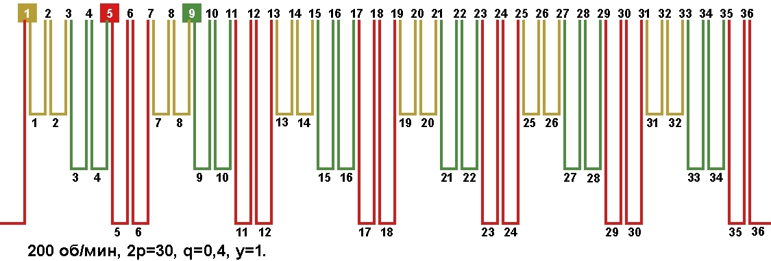 Схема укладки обмотки электродвигателя с количеством пазов 36, 2p=30 200 об/мин.