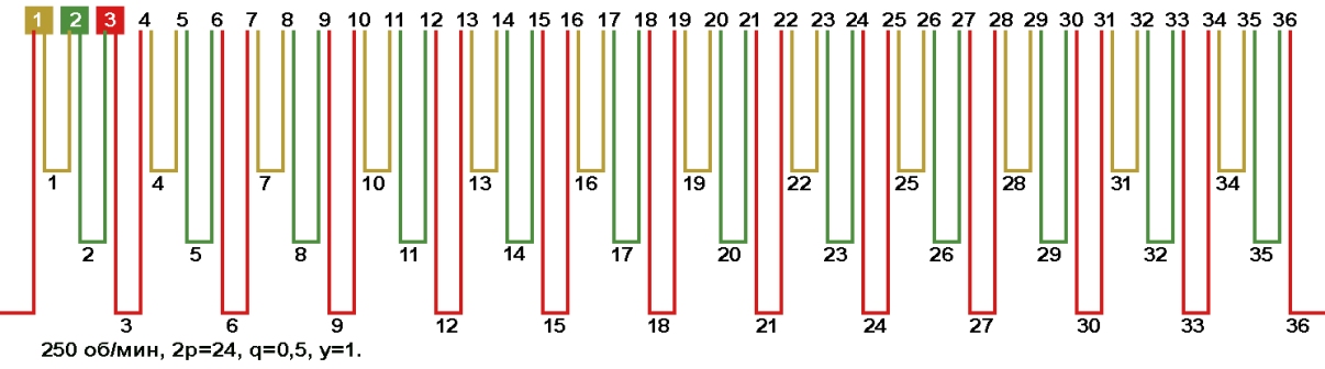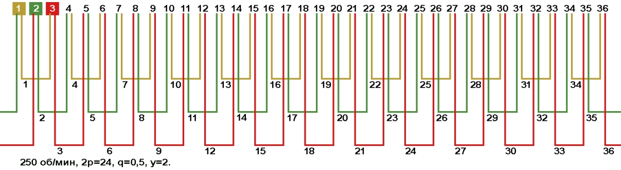 Схемы укладки обмоток электродвигателей с количеством пазов 36, 2p=24 250 об/мин.