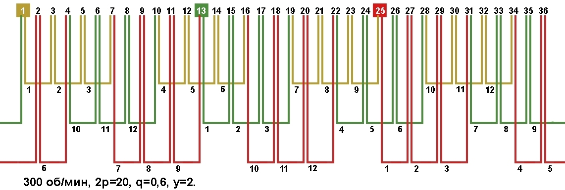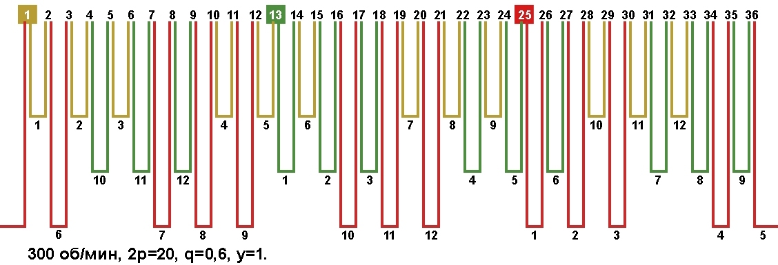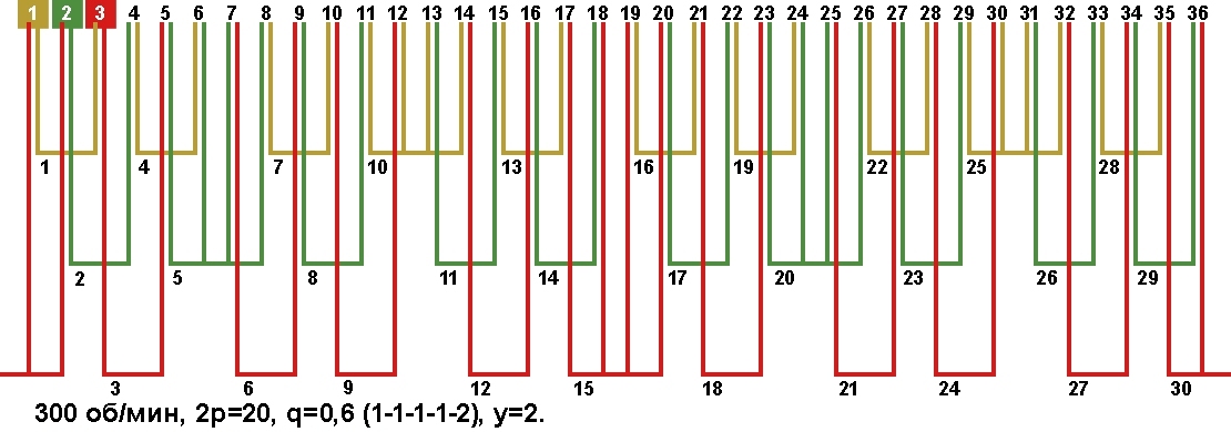 Схема укладки обмотки электродвигателя с количеством пазов 36, 2p=20 300 об/мин.