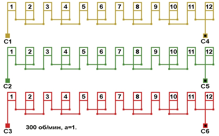 | Начало фаз по пазам | C1;C2;C3 | 1;2;3 |