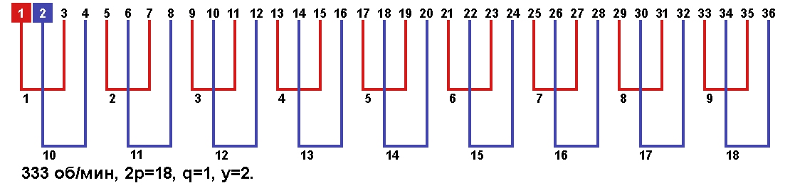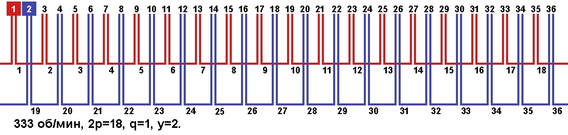 Схема укладки обмотки однофазного электродвигателя с количеством пазов 36, 2p=18 333 об/мин.