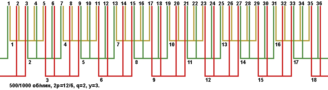 Схема укладки двухскоростной обмотки. Z1=36, 2p=12/6, 500/1000 об/мин., q=2, шаг у=3, параллельных ветвей а=1, а=3.