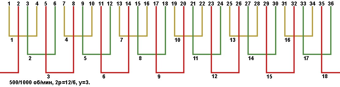 Схема укладки двухскоростной обмотки. Z1=36, 2p=12/6, 500/1000 об/мин., шаг у=3, параллельных ветвей а=1, а=3.