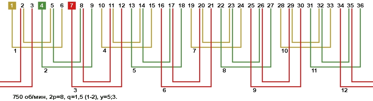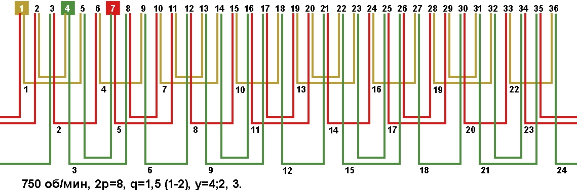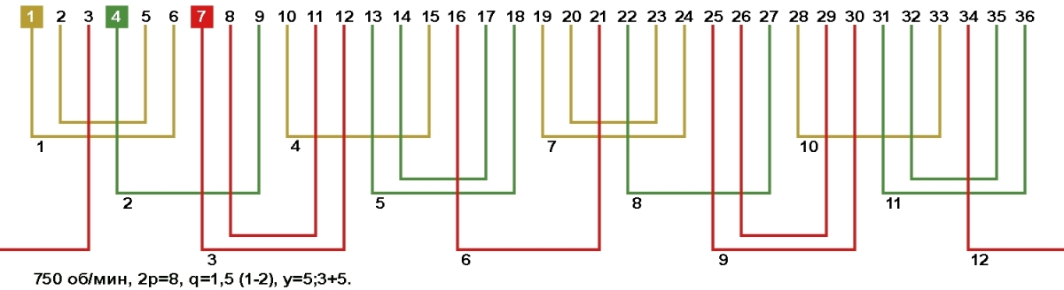 Схемы укладки обмоток электродвигателей с количеством пазов 36, 2p=8 750 об/мин.