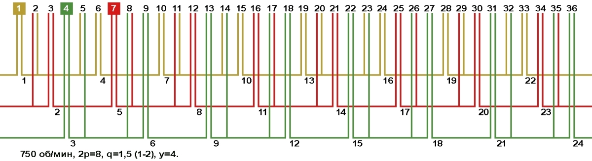 | Начало фаз по пазам | C1;C2;C3 | 1;4;7 |