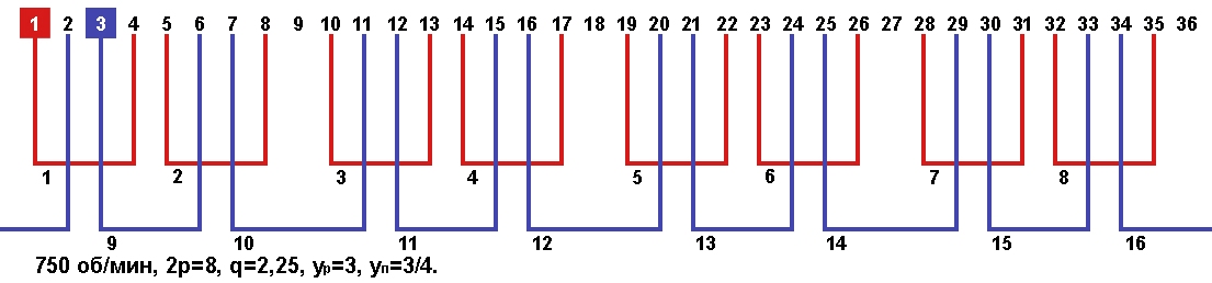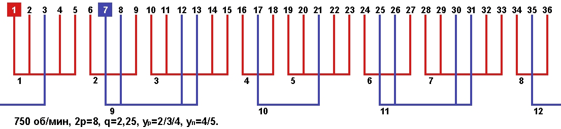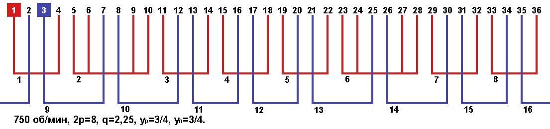 Схема укладки обмотки однофазного электродвигателя с количеством пазов 36, 2p=8 750 об/мин.