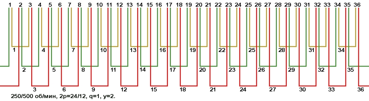 Схемы укладки двухскоростных обмоток. Z1=36, 2p=24/12, 250/500 об/мин.