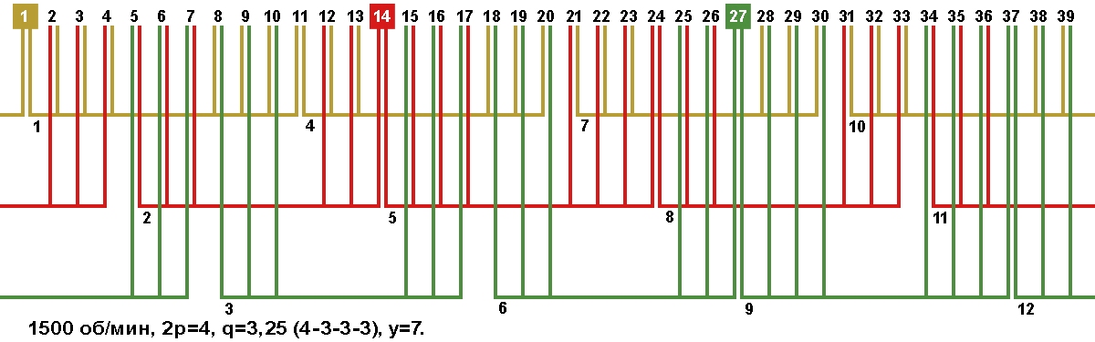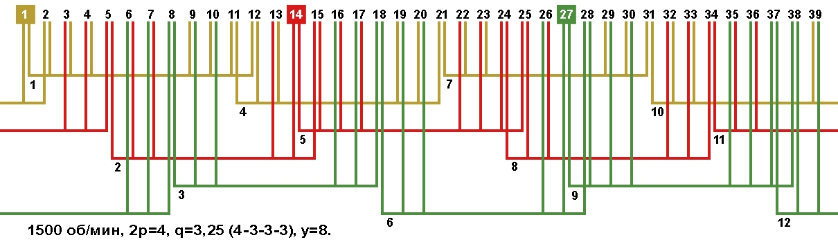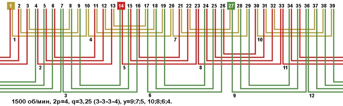 Схемы укладки обмоток электродвигателей с количеством пазов 39, 2p=4 1500 об/мин.