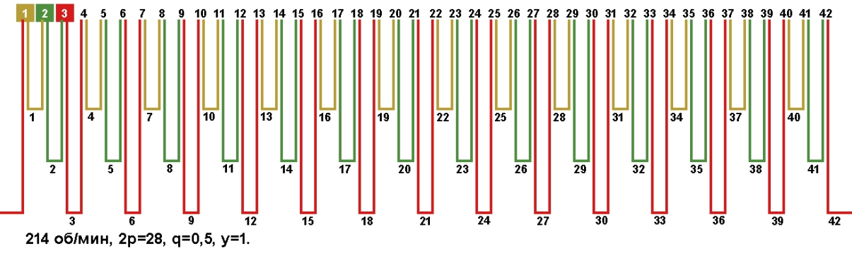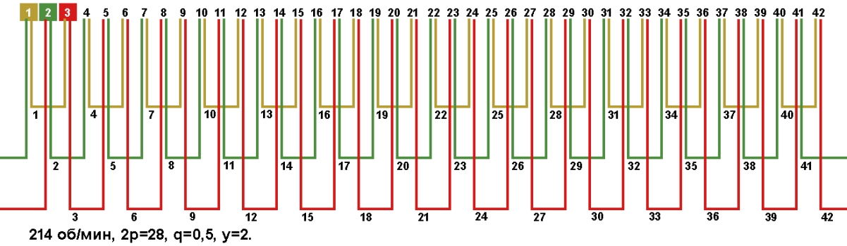 Схема укладки обмотки электродвигателя с количеством пазов 42, 2p=28 214 об/мин.
