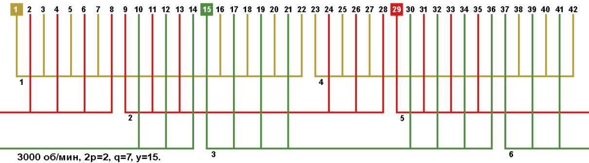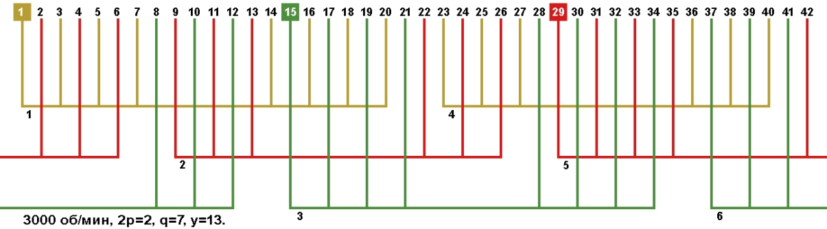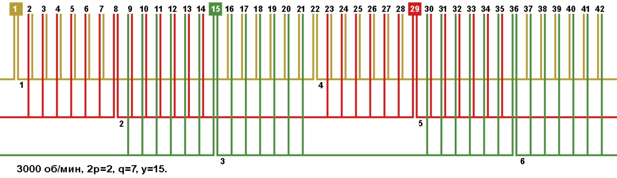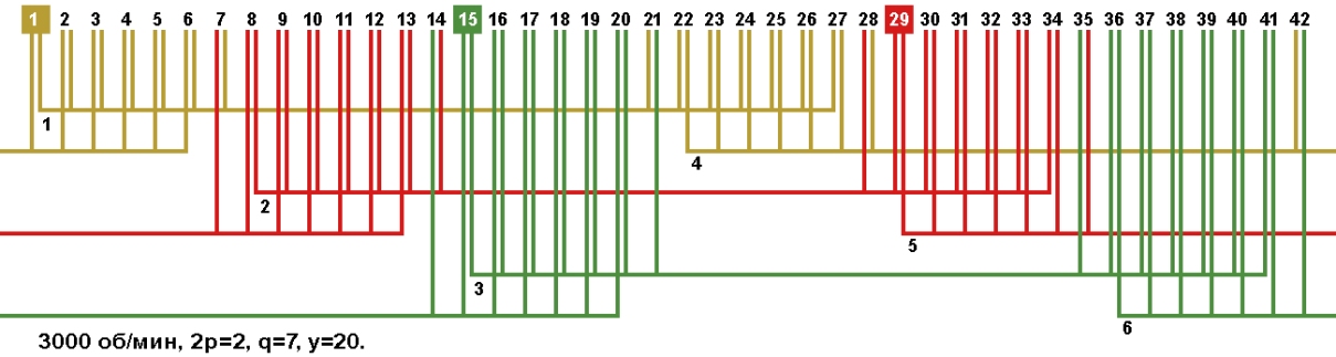 | Начало фаз по пазам | C1;C2;C3 | 1;15;29 |