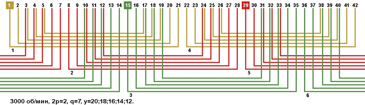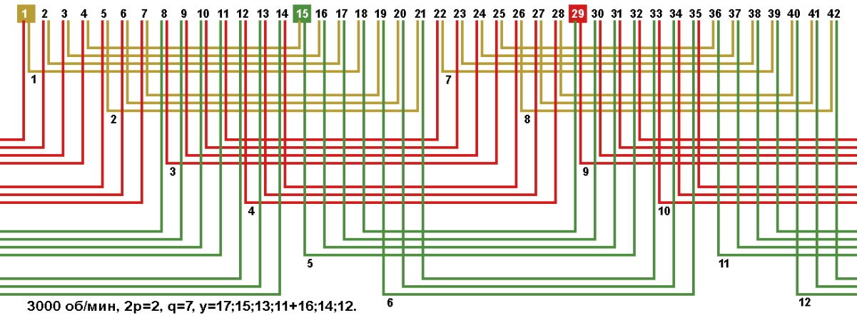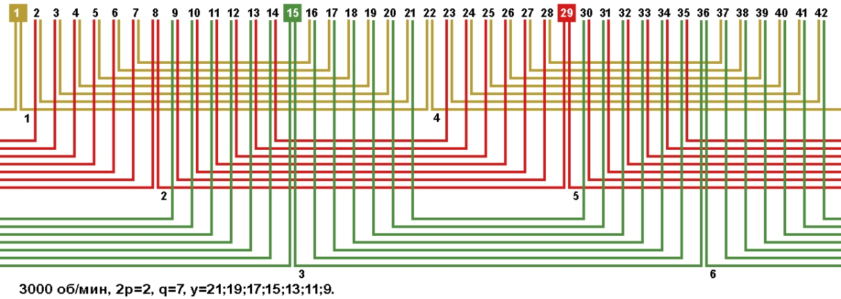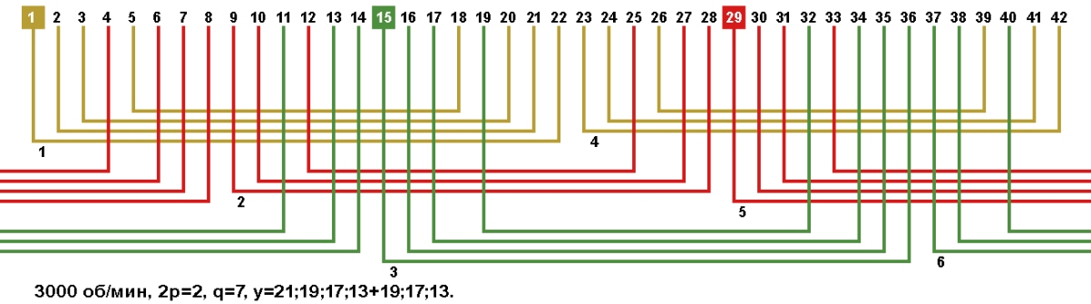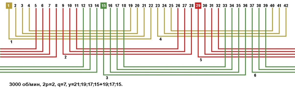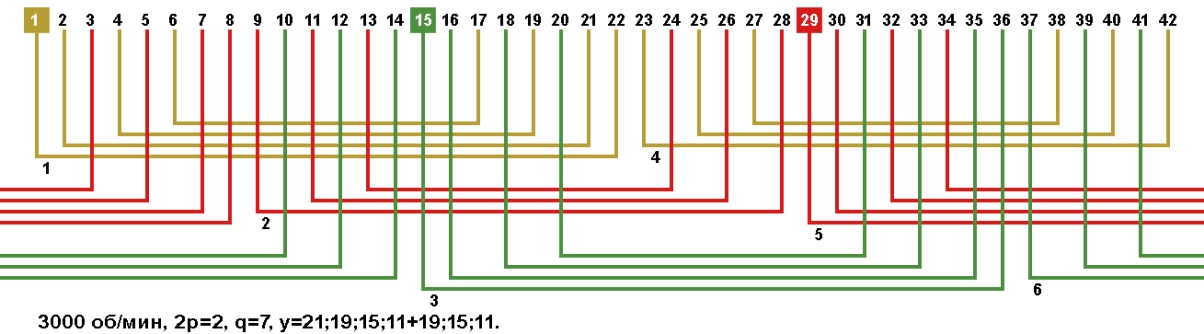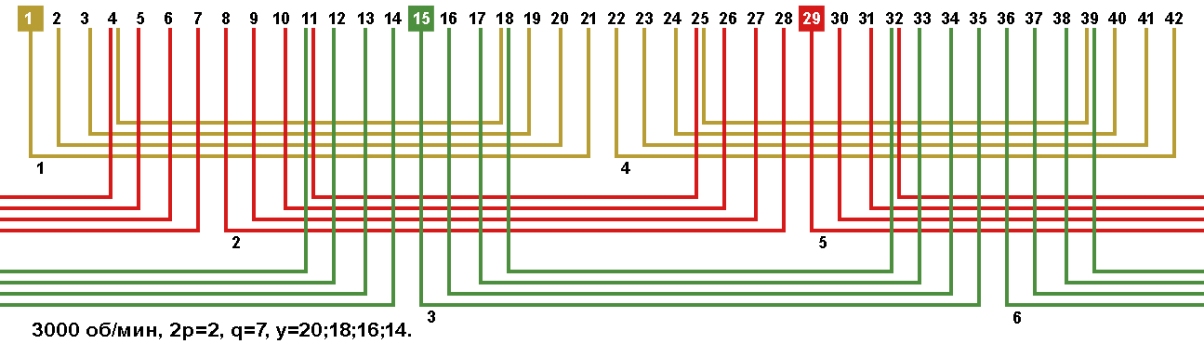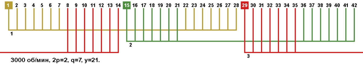 Схемы укладки обмоток электродвигателей с количеством пазов 42, 2p=2 3000 об/мин.