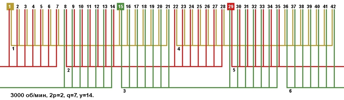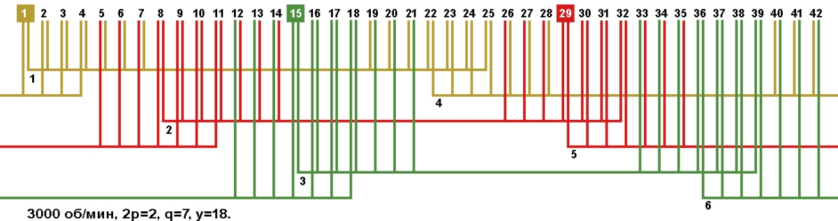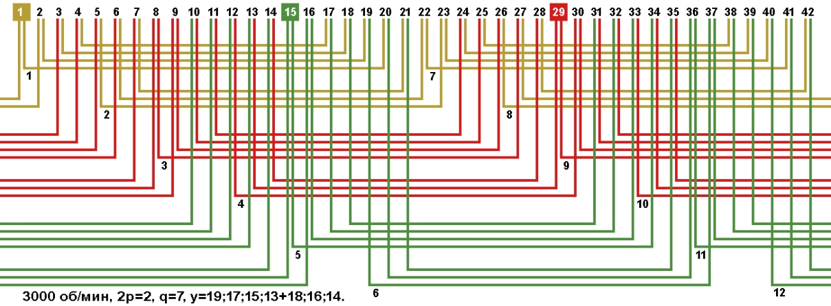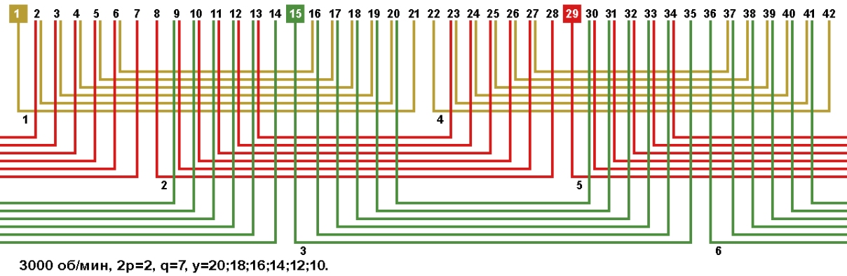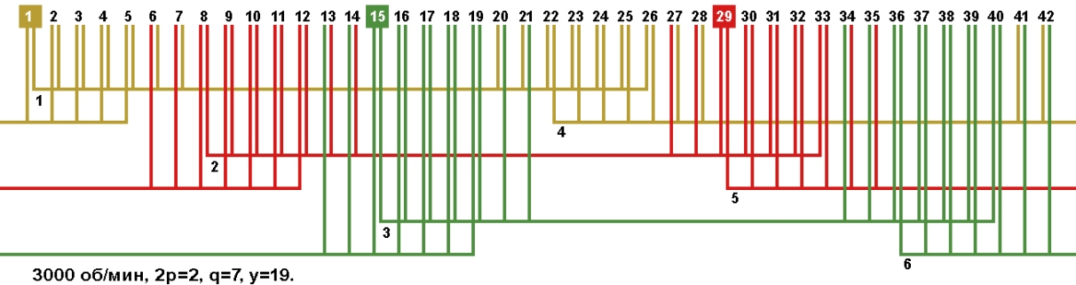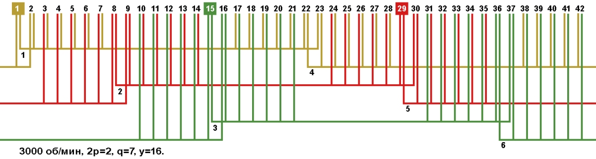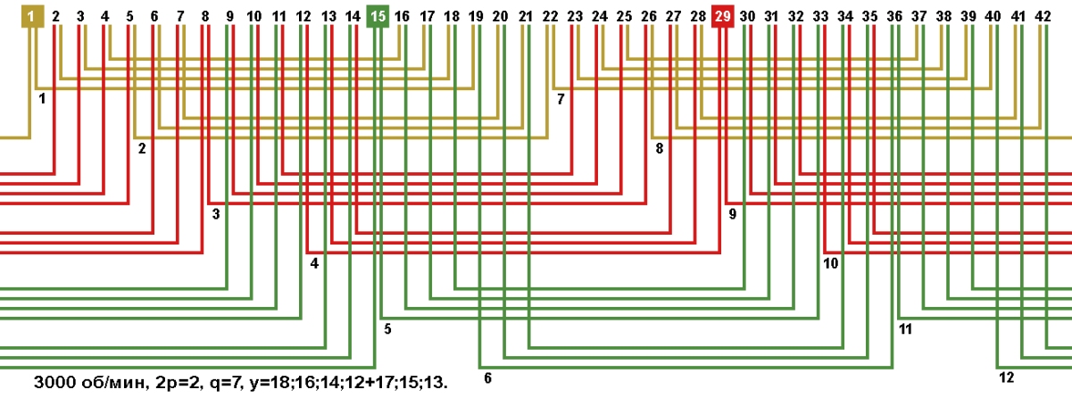 Схемы укладки обмоток электродвигателей с количеством пазов 42, 2p=2 3000 об/мин.