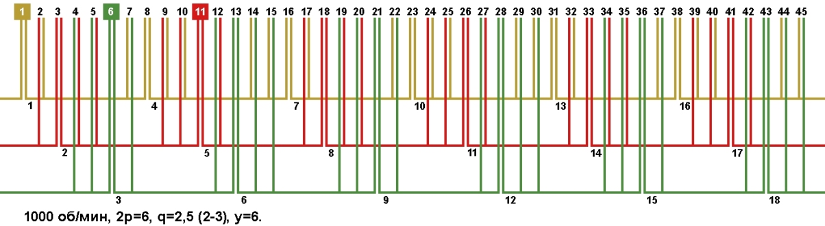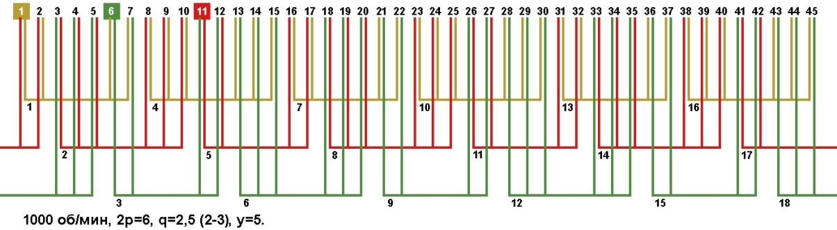 | Начало фаз по пазам | C1;C2;C3 | 1;6;11 |