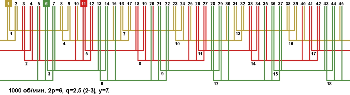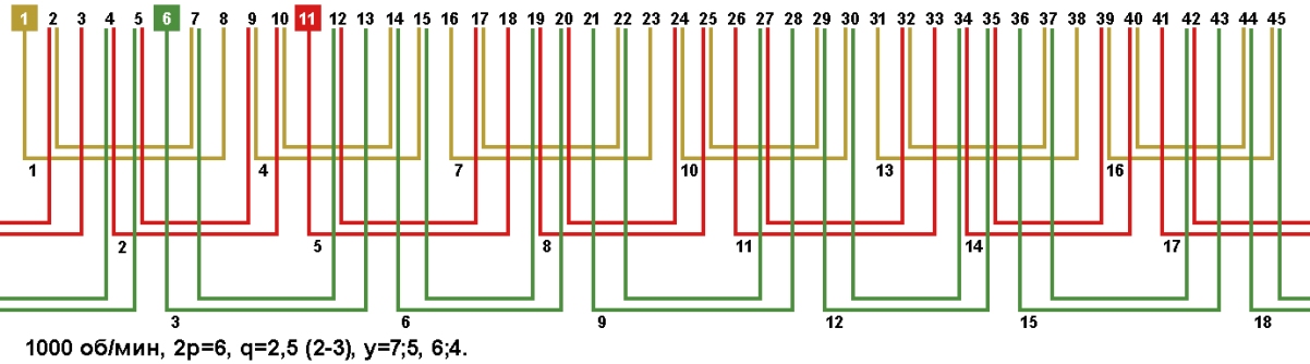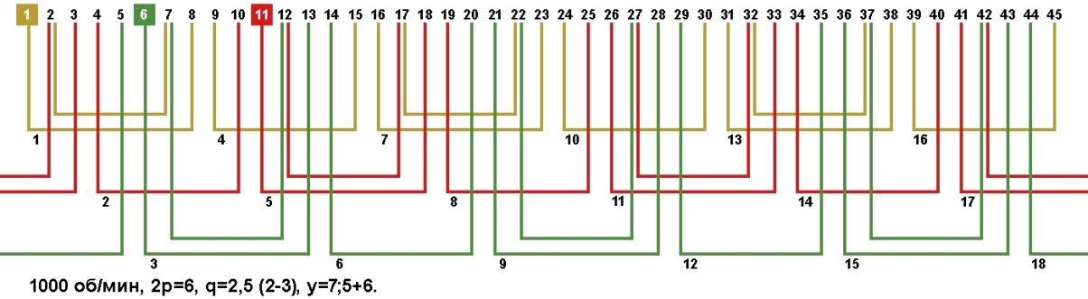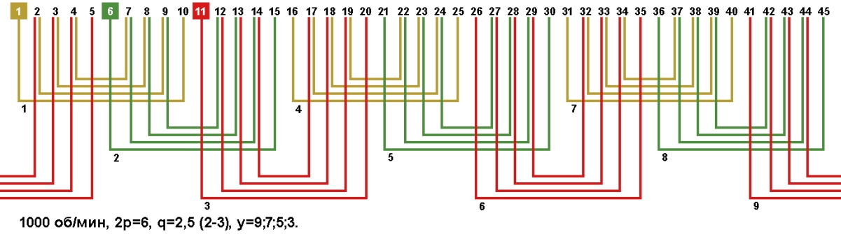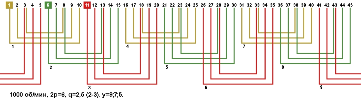 Схемы укладки обмоток электродвигателей с количеством пазов 45, 2p=6 1000 об/мин.