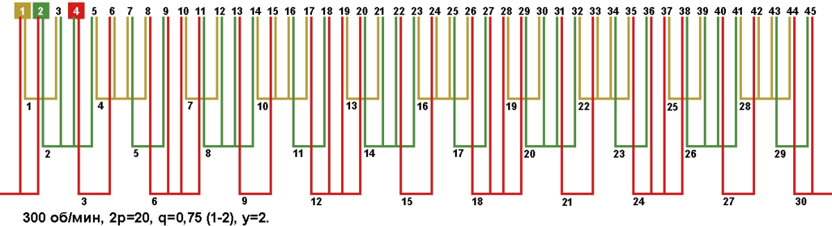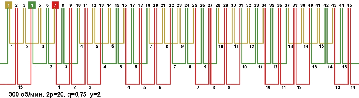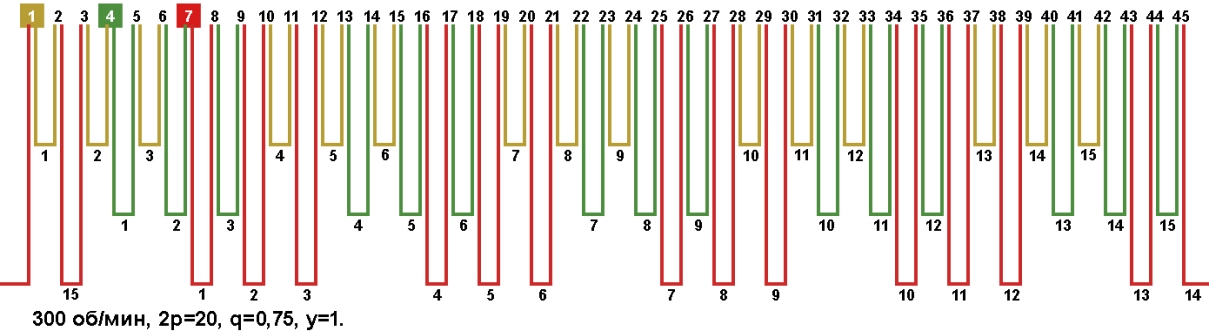Схема укладки обмотки электродвигателя с количеством пазов 45, 2p=20 300 об/мин.