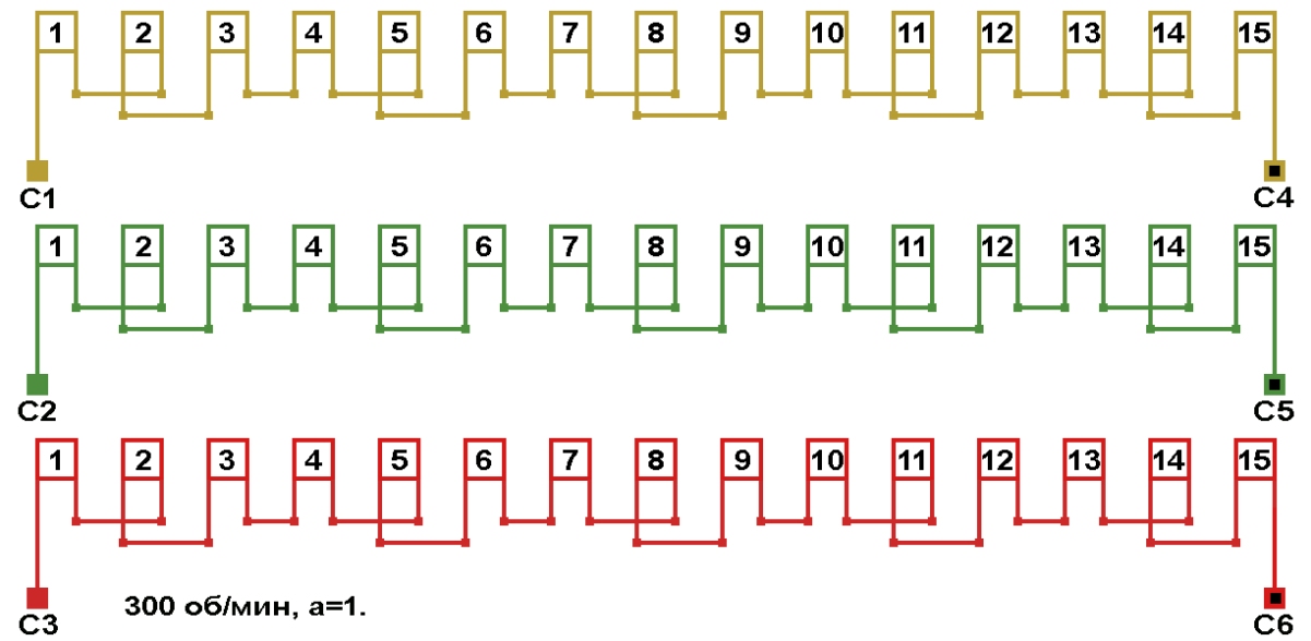 | Начало фаз по пазам | C1;C2;C3 | 1;2;4 |