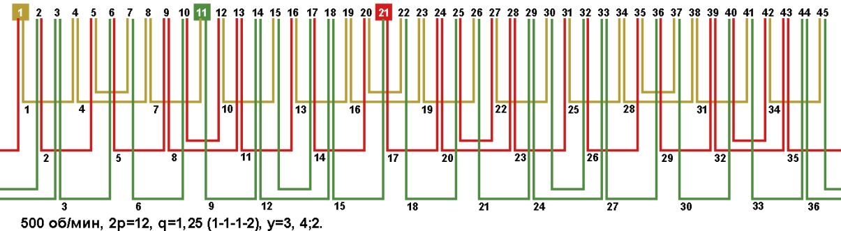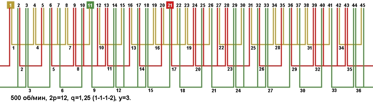 Схема укладки обмотки электродвигателя с количеством пазов 45, 2p=12 500 об/мин.
