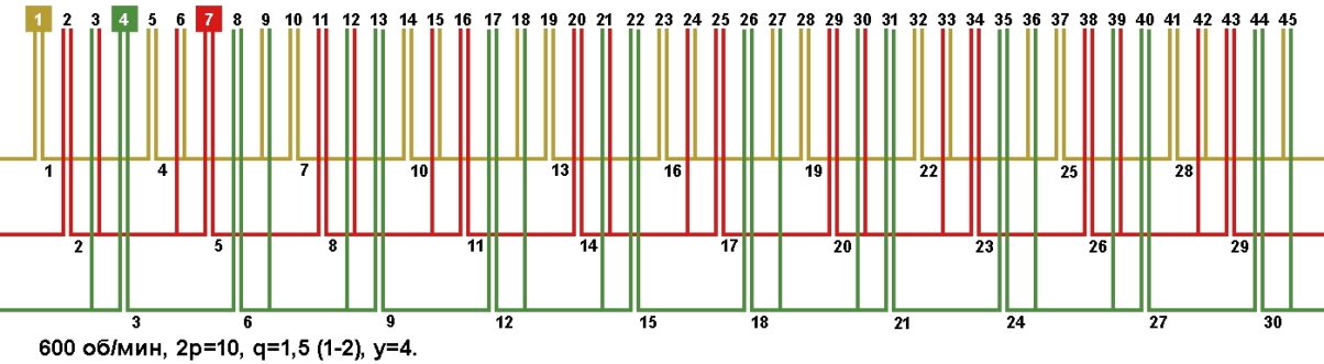 | Начало фаз по пазам | C1;C2;C3 | 1;4;7 |