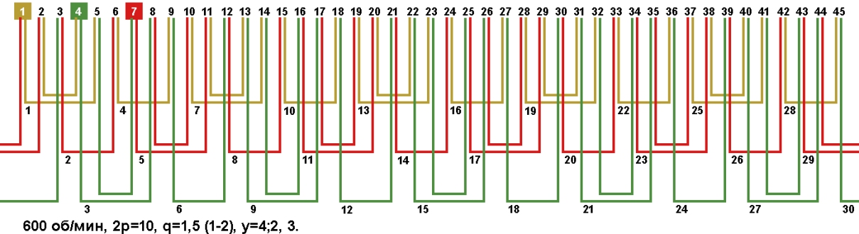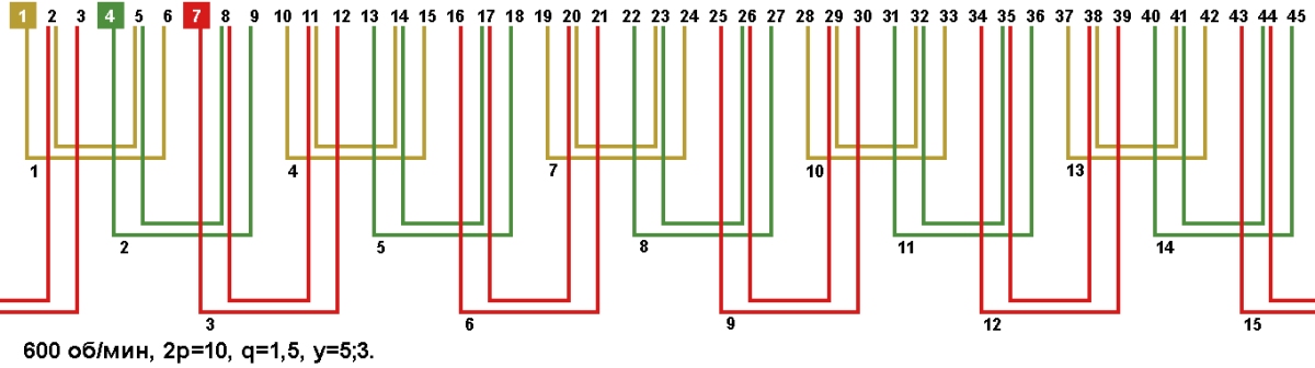 Схема укладки обмотки электродвигателя с количеством пазов 45, 2p=10 600 об/мин.