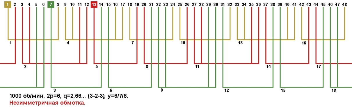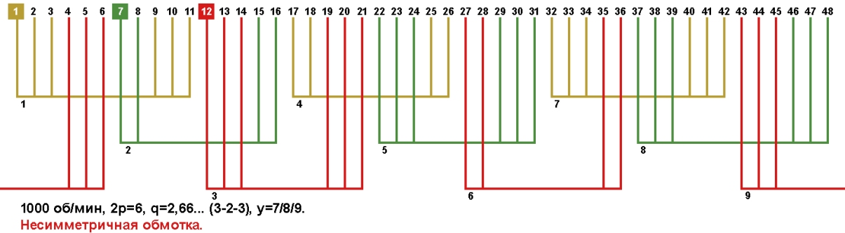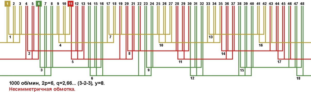 Схема укладки несимметричной обмотки электродвигателя с количеством пазов 48, 2p=6 1000 об/мин.