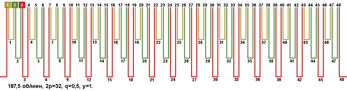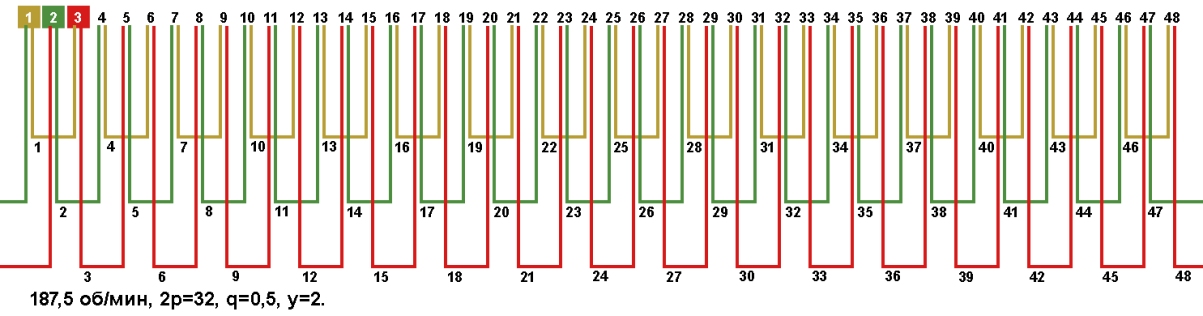 Схема укладки обмотки электродвигателя с количеством пазов 48, 2p=32 187,5 об/мин.