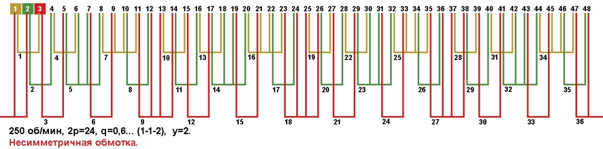 Схемы укладки обмоток электродвигателей с количеством пазов 48, 2p=24 250 об/мин.