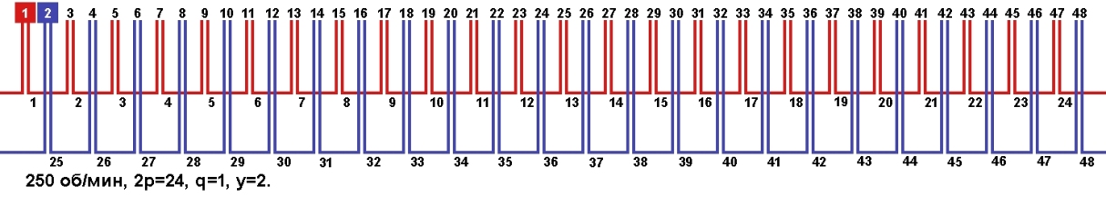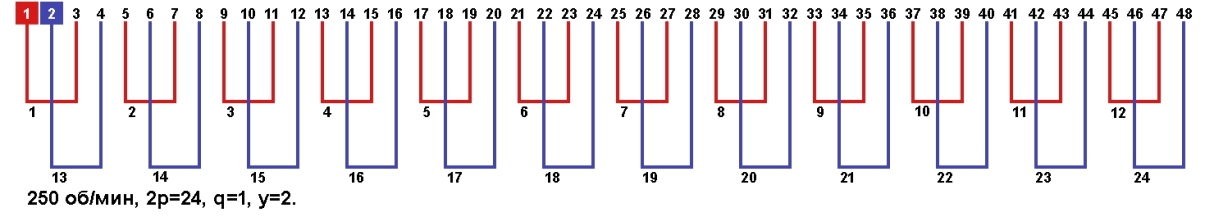Схема укладки обмотки однофазного электродвигателя с количеством пазов 48, 2p=24 250 об/мин.
