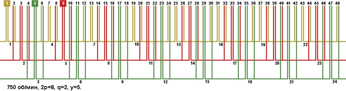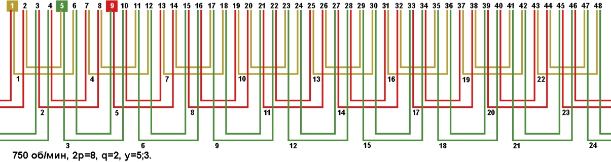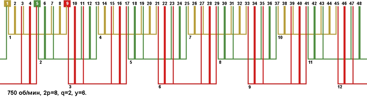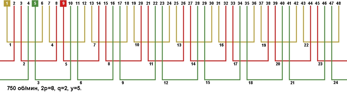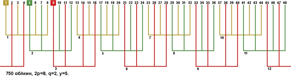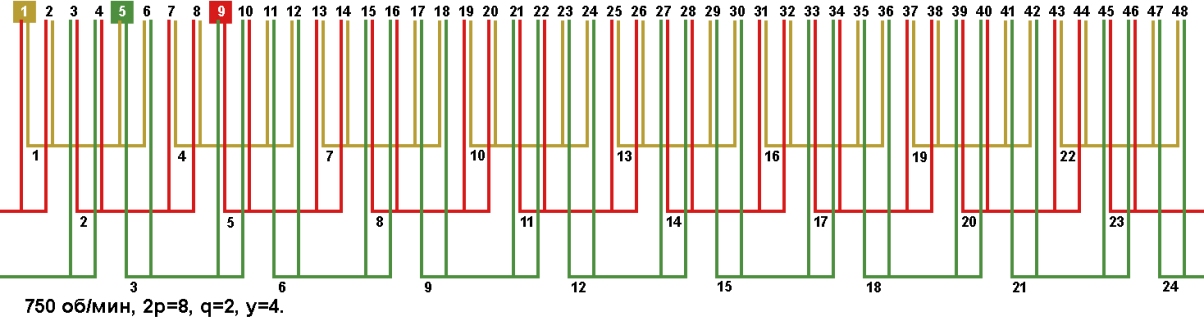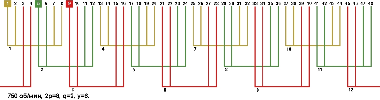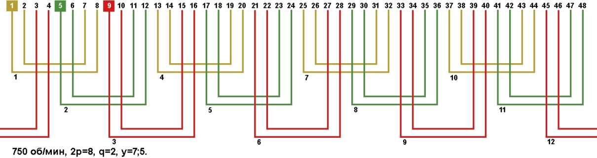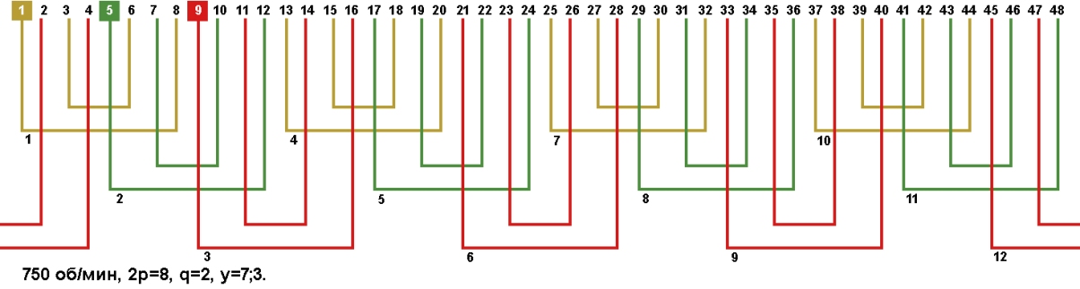 Схемы укладки обмоток электродвигателей с количеством пазов 48, 2p=8 750 об/мин.