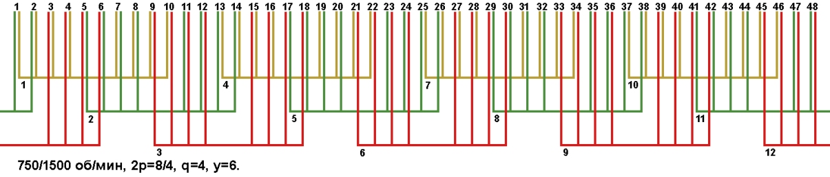 Схема укладки двухскоростной обмотки. Z1=48, 2p=8/4, 750/1500 об/мин., q=4, шаг у=6, параллельных ветвей а=1, а=2.