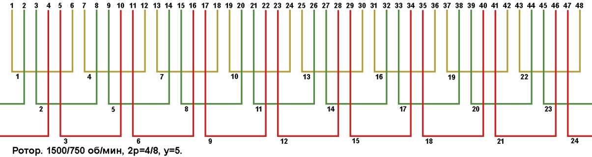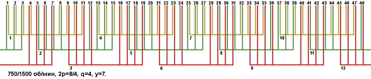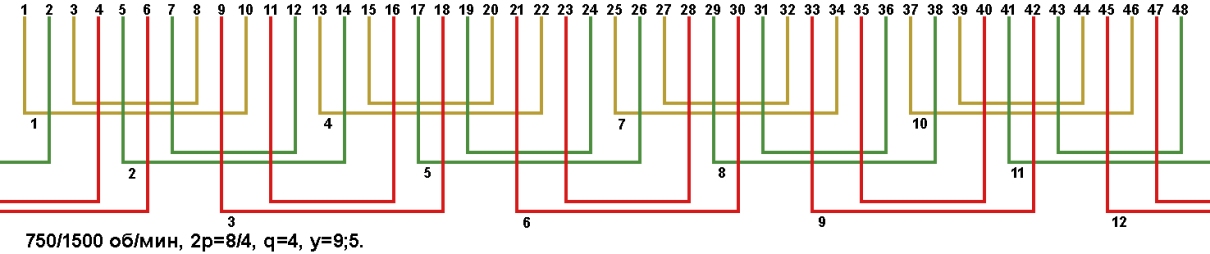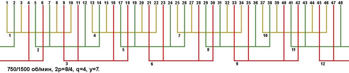 Схемы укладки двухскоростных обмоток. Z1=48, 2p=8/4, 750/1500 об/мин.
