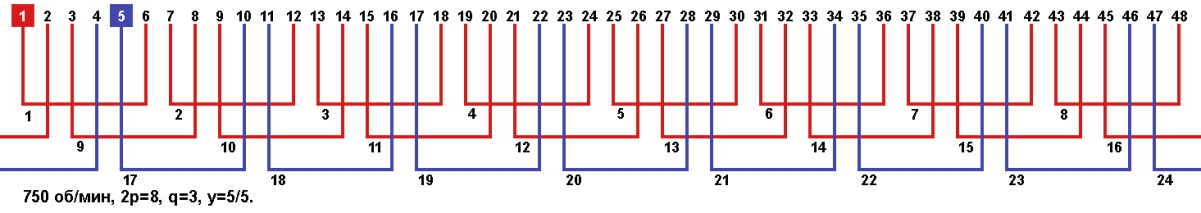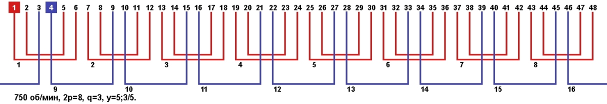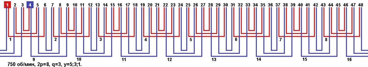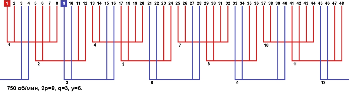 Схема укладки обмотки однофазного электродвигателя с количеством пазов 48, 2p=8 750 об/мин.